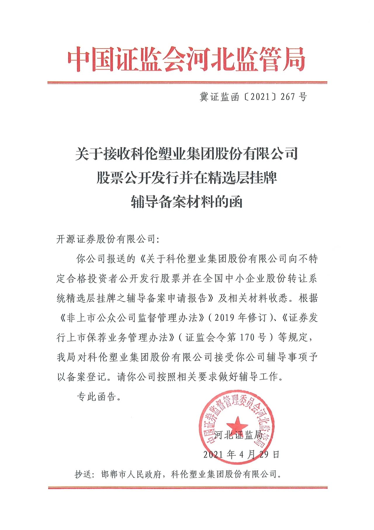 日前,科倫塑業集團股份有限公司IPO(首次發行股票)取得可喜進展,中國證監會河北監管局已批準開源證券股份有限公司對科倫塑業集團進行上市輔導。